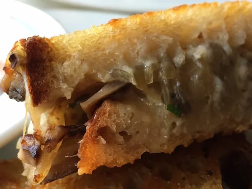 The folks from Cake & Ale have graced our town with their latest offering, Bread & Butterfly. This place has a perfect setting in Inman park and is marked by gorgeous, simple details. I am particularly smitten by the open space where they throw open the doors when Atlanta weather cooperates, and, let's face it, Atlanta is at least as pleasant as Paris when it comes to temperatures!The tea is fresh brewed and comes in a self-service carafe (I love this!).There is no artificial sweetener, but with simple syrup available, I couldn't quibble. Details! Details!So the atmosphere was fabulous, but what about the food? I split my meal with my niece Lindsay who is at least as opinionated as I am about what she eats. We started with the onion and mushroom "dip" sandwich with ooooey-gooooey-strinnnngy cheese.